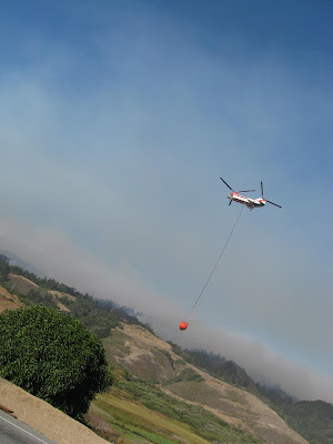 In fact there was a creek that the fire fighting helicopters were using to refill their buckets and drop on the fire line which was about a mile or so away. The wind was blowing in the opposite direction so we had a clear view of the water filling and dropping operations. It was at the same time sad and exciting. I took a few pictures before the batteries ran out on our camera. You can see the helicopter and the smoke in the hills behind.